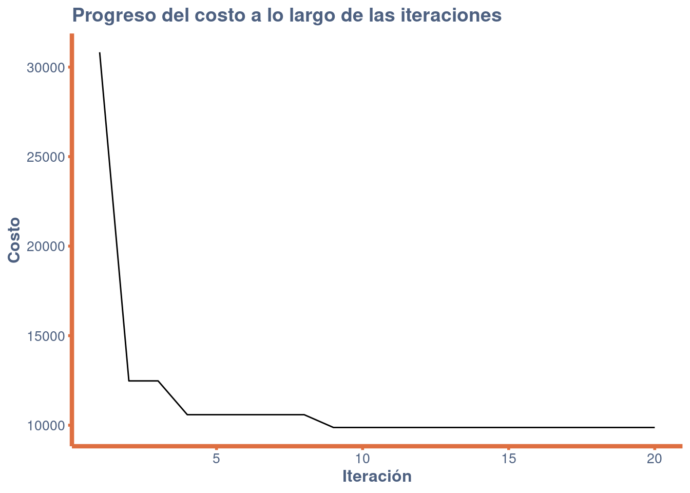 # Función para calcular la distancia euclidiana entre dos puntoseuc_2d <-function(c1, c2) {return(round(sqrt((c1[1] - c2[1])^2+ (c1[2] - c2[2])^2)))}# Función para calcular el costo de una permutación de ciudadescost <-function(perm, cities) { distance <-0for (i inseq_along(perm)) { c1 <- perm[i] c2 <-if (i ==length(perm)) perm[1] else perm[i +1] distance <- distance +euc_2d(cities[c1, ], cities[c2, ]) }return(distance)}# Función para generar una permutación aleatoria de las ciudadesrandom_permutation <-function(cities) {return(sample(nrow(cities)))}# Función para realizar una operación de dos-opt estocástica en una permutaciónstochastic_two_opt <-function(perm) { c1 <-sample(length(perm), 1) exclude <-c(c1, if (c1 ==1) length(perm) else c1 -1, if (c1 ==length(perm)) 1else c1 +1) c2 <-sample(length(perm), 1)while (c2 %in% exclude) { c2 <-sample(length(perm), 1) }if (c2 < c1) { temp <- c1 c1 <- c2 c2 <- temp } perm[c1:c2] <-rev(perm[c1:c2])return(perm)}# Función para realizar una búsqueda local en el espacio de las permutacioneslocal_search <-function(best, cities, max_no_improv, neighborhood) { count <-0repeat { candidate <-list() candidate$vector <-stochastic_two_opt(best$vector) candidate$cost <-cost(candidate$vector, cities)if (candidate$cost < best$cost) { count <-0 best <- candidate } else { count <- count +1 }if (count >= max_no_improv) break }return(best)}# Función de búsqueda principalsearch <-function(cities, neighborhoods, max_no_improv, max_no_improv_ls) { best <-list() best$vector <-random_permutation(cities) best$cost <-cost(best$vector, cities) iter <-0 count <-0 stop_loop <-FALSE# Creamos un dataframe para guardar las soluciones solutions <-data.frame(iteration=integer(), cost=double())for (neigh in neighborhoods) {if (stop_loop) {break } candidate <-list() candidate$vector <- best$vectorfor (i inseq_len(neigh)) { candidate$vector <-stochastic_two_opt(candidate$vector) } candidate$cost <-cost(candidate$vector, cities) candidate <-local_search(candidate, cities, max_no_improv_ls, neigh)cat(" > iteration", iter +1, ", neigh=", neigh, ", best=", best$cost, "\n") iter <- iter +1# Guardamos la solución en el dataframe solutions <-rbind(solutions, data.frame(iteration=iter, cost=best$cost))if (candidate$cost < best$cost) { best <- candidate count <-0cat("New best, restarting neighborhood search.\n") } else { count <- count +1 }if (count >= max_no_improv) { stop_loop <-TRUE } }return(solutions)}# Configuración del problemaberlin52 <-matrix(c(565,575,25,185,345,750,945,685,845,655,880,660,25,230,525,1000,580,1175,650,1130,1605,620,1220,580,1465,200,1530,5,845,680,725,370,145,665,415,635,510,875,560,365,300,465,520,585,480,415,835,625,975,580,1215,245,1320,315,1250,400,660,180,410,250,420,555,575,665,1150,1160,700,580,685,595,685,610,770,610,795,645,720,635,760,650,475,960,95,260,875,920,700,500,555,815,830,485,1170,65,830,610,605,625,595,360,1340,725,1740,245), ncol =2, byrow =TRUE)# Configuración del algoritmomax_no_improv <-50max_no_improv_ls <-70neighborhoods <-1:20# Ejecutar el algoritmobest <-search(berlin52, neighborhoods, max_no_improv, max_no_improv_ls)