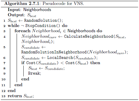 El pseudocódigo muestra que la búsqueda sistemática de vecindarios en expansión para un óptimo local se abandona cuando se alcanza una mejora global (mostrada con el salto Break).